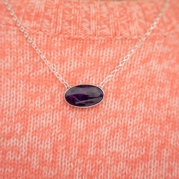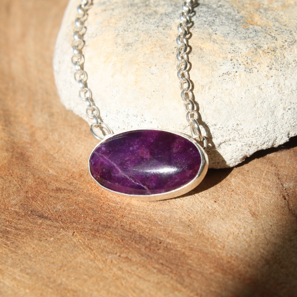A rare dark purple Sugilite stone is set in silver with a silver belcher chain at 18 inches.