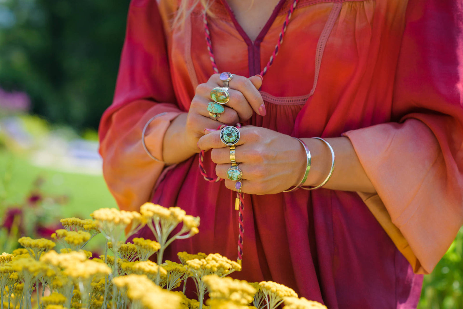 Here I studied with a leading silversmith and expert stone setter, while embracing the rugged desert beauty and colourful culture of this artistic town. It was my teacher who first introduced me to the sheer variety of American Turquoise; a stone that I already knew, but had never experienced in its full, glorious complexity. I remember the moment she took me to a stone shop and pulled open a drawer full of turquoise in electric blues and greens, all with unique patterns and shapes. I fell in love straight away. Since then I have returned to New Mexico every year to learn from brilliant jewellers, source extraordinary gemstones and fuel my creative tank. I am forever developing my skill set and searching for new ideas so that I can bring you more and more eye-catching, unique designs.