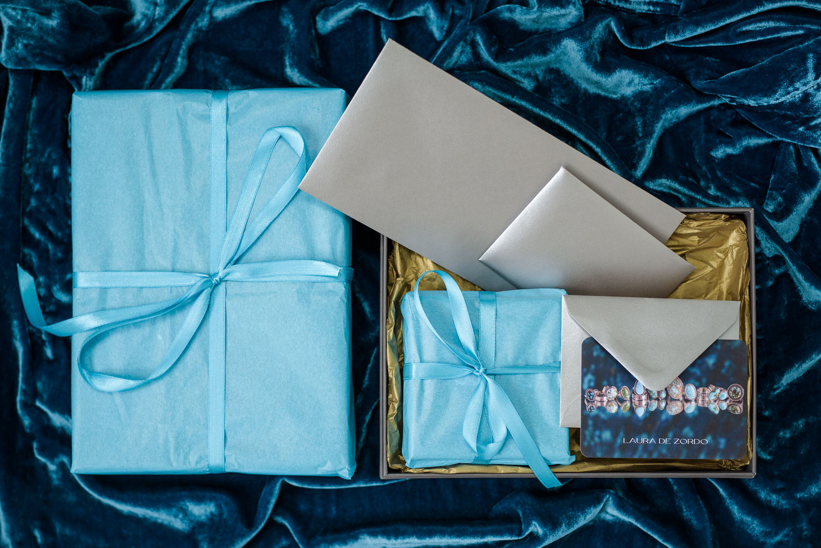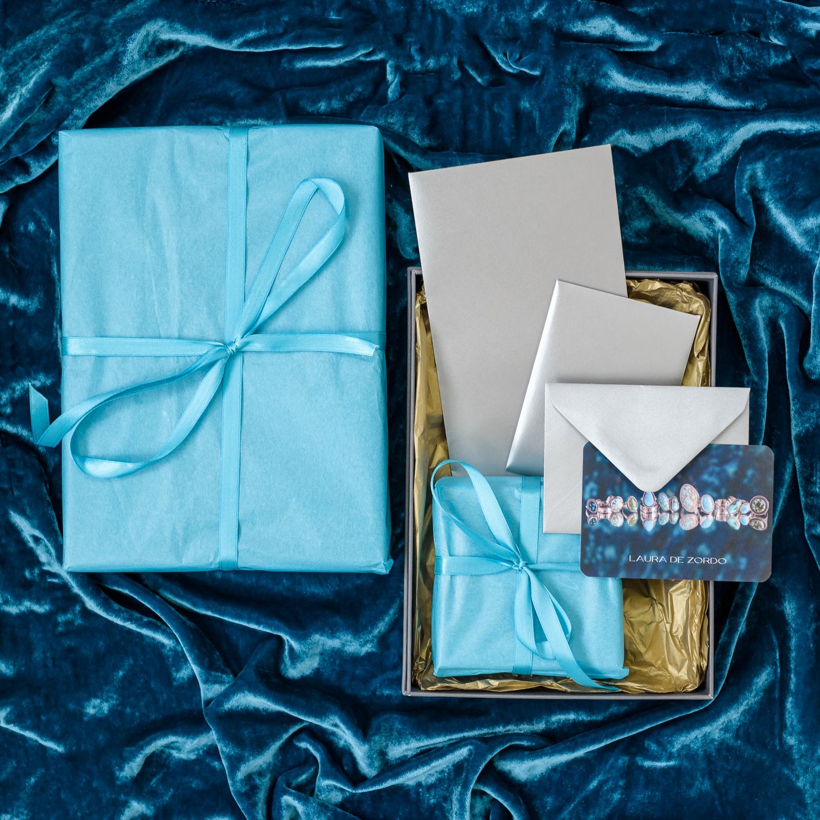 Present One: On the big day your beloved will receive the beautifully wrapped gift box along with a Laura De Zordo set of ring sizers and your ‘Design Your Own’ gift voucher. More importantly the box also contains selection of printed cards featuring beautiful gemstones and sample rings. This means when they open the package they can start dreaming right away about their new jewellery.