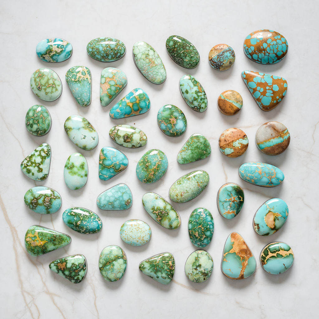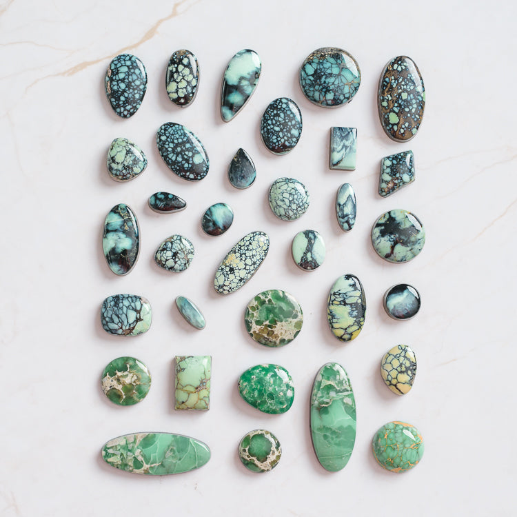 Green Turquoise bursting with patterns from the Sonoran mines in Mexico on the left. Various different stones from the Royston mine in Nevada down the two coloumns on the right. Royston Ribbon rock are the ones that look like they have a lighting strike of turquoise down the middle. Click here to see 'Ready to Ship' Turquoise Rings