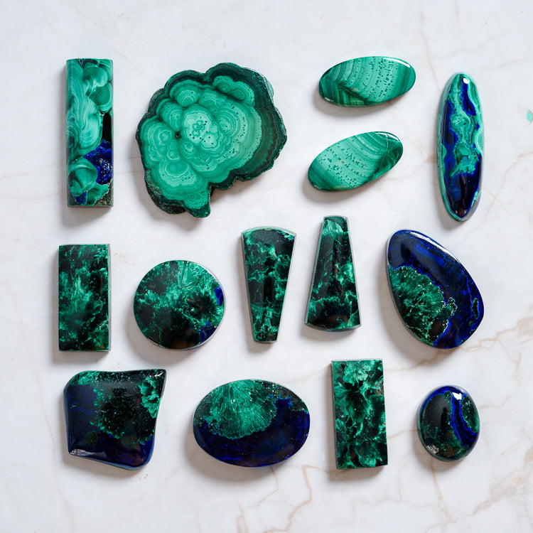 These beautiful blue and green mixed stones are called Azurite/Malachite and have wonderful patterns. The two tone green of the malachite in the centre top are also great for making pendants or earrings.