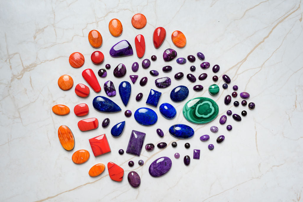 Here we have a selection of primary and secondary colours purple Sugilite, green Malachite, blue Lapis Lazuli, red Rosarita and orange Spiny Oyster shell. See Gallery of Past Pieces for red Rosarita heart pendant.