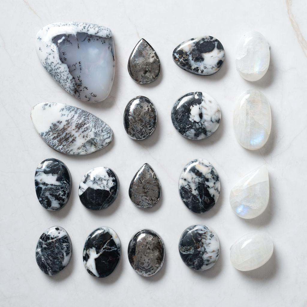 From white Rainbow Moonstone to black and white 'White Buffalo - Magnesite' to Native Silver and Dendrite Opal with fern patterns.