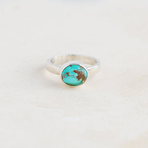 This beautiful Royston turquoise has all the markings of a larger Royston packed in a small stone. It is glowing blue with bits of green and an incredible matrix. As with most Royston turquoise the colours just glow and the stone has been set on the side in this piece. This sterling silver ring is small and great for everyday wear.