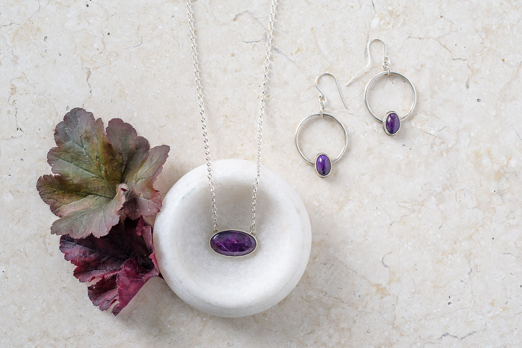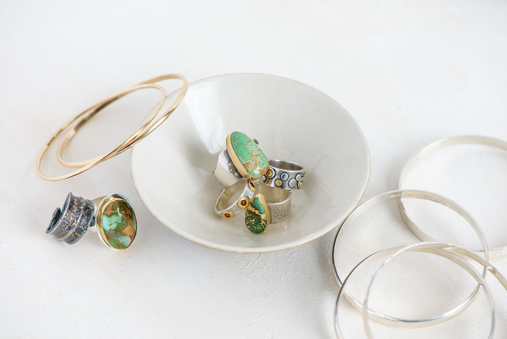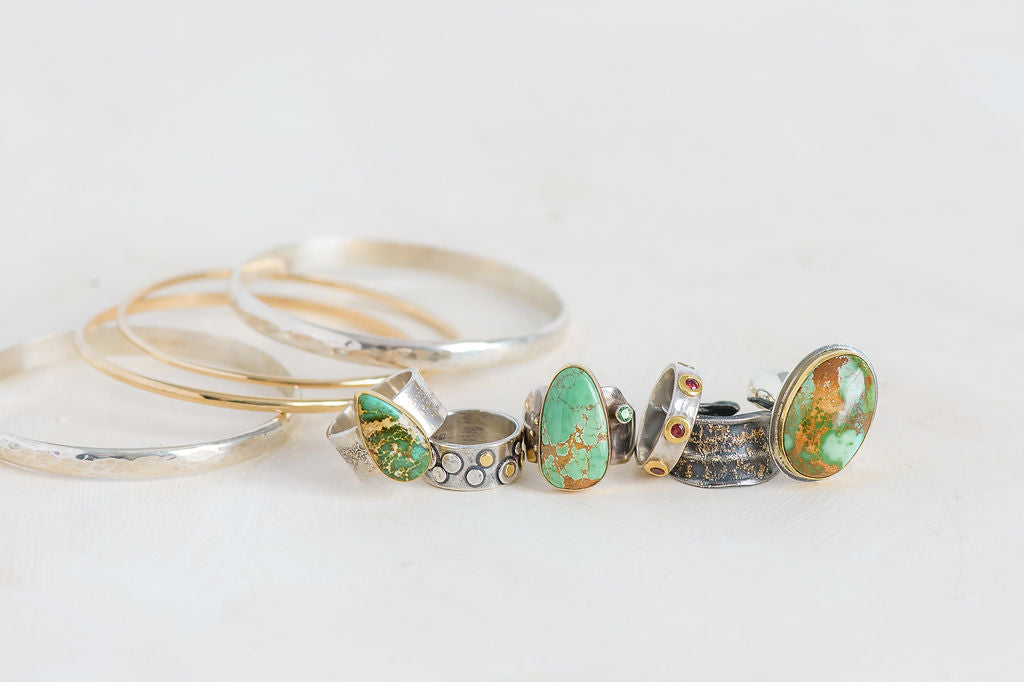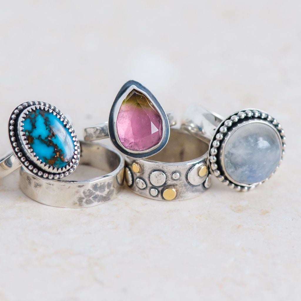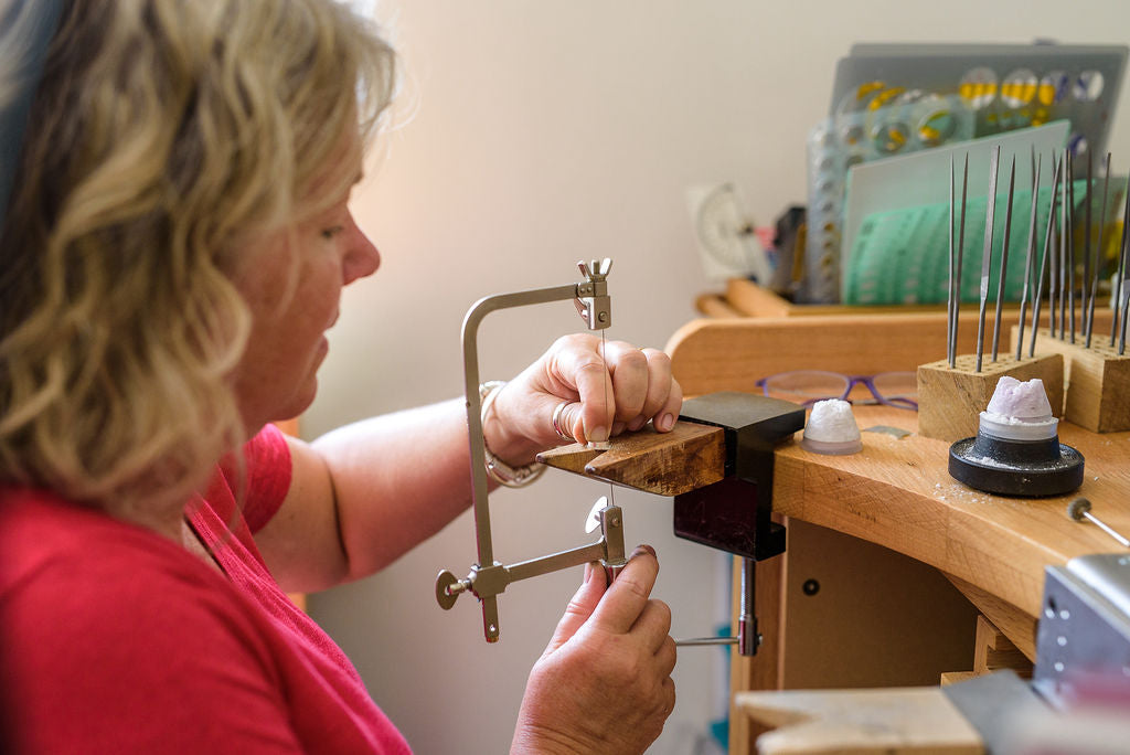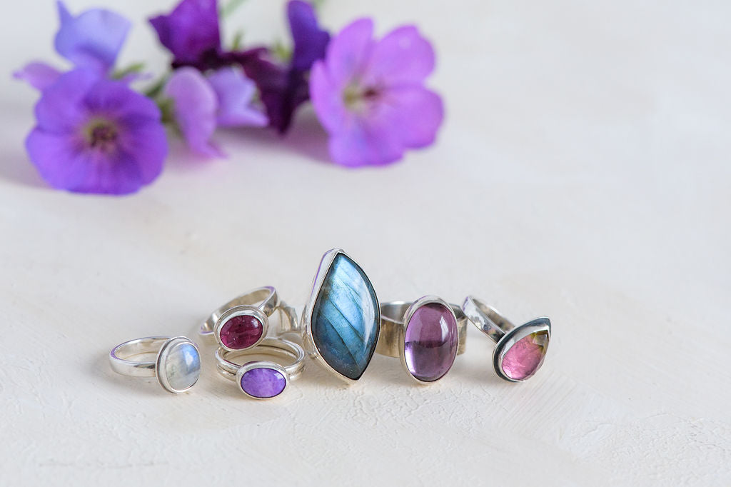 My jewellery is fabricated (this means crafted by hand) from my studio in the beautiful South Downs, Hampshire. Fabricating means I use metal in the form of sheet, wire or grain, in all different sizes, to create rings, earrings, pendants and bangles. Then if you are interested, I add gemstones - this is really my favourite part of making and what makes your pieces unique to you.