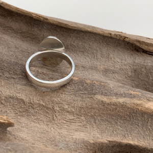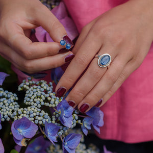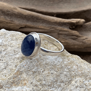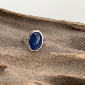 A sparkly Kyanite which is the colour of denim. Perfect to go with your casual days in jeans. The oval stone is in a simple setting on a sterling silver double band