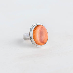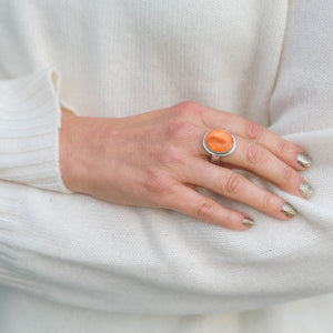 Multiple colours of orange run through this gorgeous spiny oyster shell ring. It reminds me of sunny days and will brighten up any grey ones. It is set on a 6x2 mm half round sterling silver ring band. This ring and contains a large bespoke Queen's Jubilee Hallmark on the exterior of the band. Want to know more about Hallmarking read here
