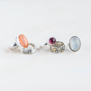 My jewellery is fabricated (this means crafted by hand) from my studio in the beautiful South Downs, Hampshire. Fabricating means I use metal in the form of sheet, wire or grain, in all different sizes, to create rings, earrings, pendants and bangles. Then if you are interested, I add gemstones - this is really my favourite part of making and what makes your pieces unique to you.